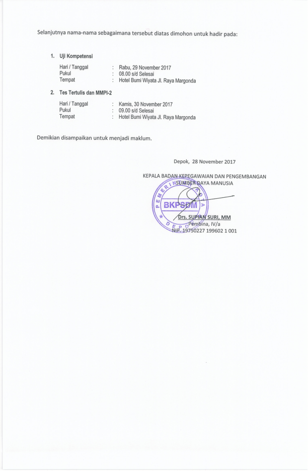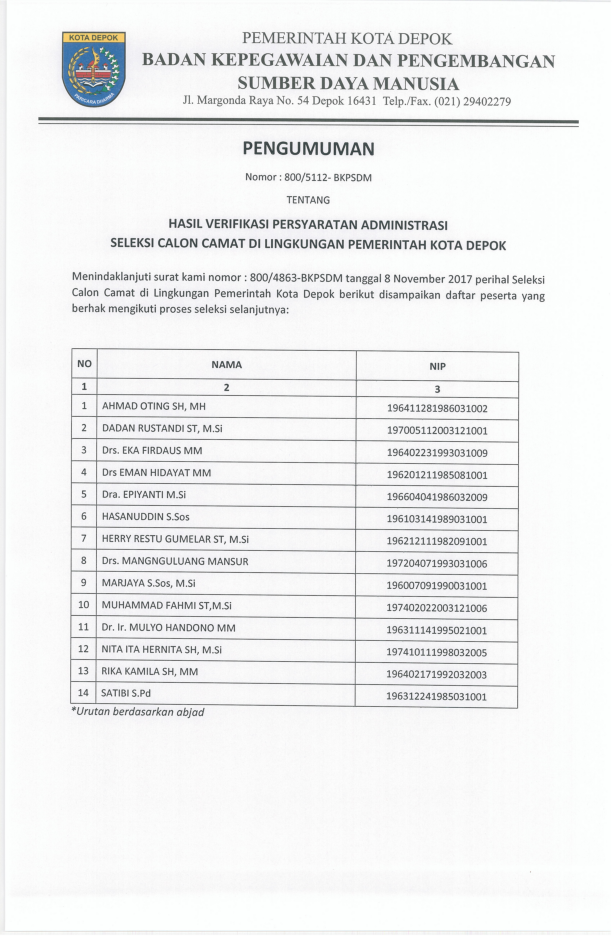 Pengumuman Hasil Verifikasi Persyaratan Administrasi Seleksi Calon Camat di Lingkungan Pemerintah Kota Depok