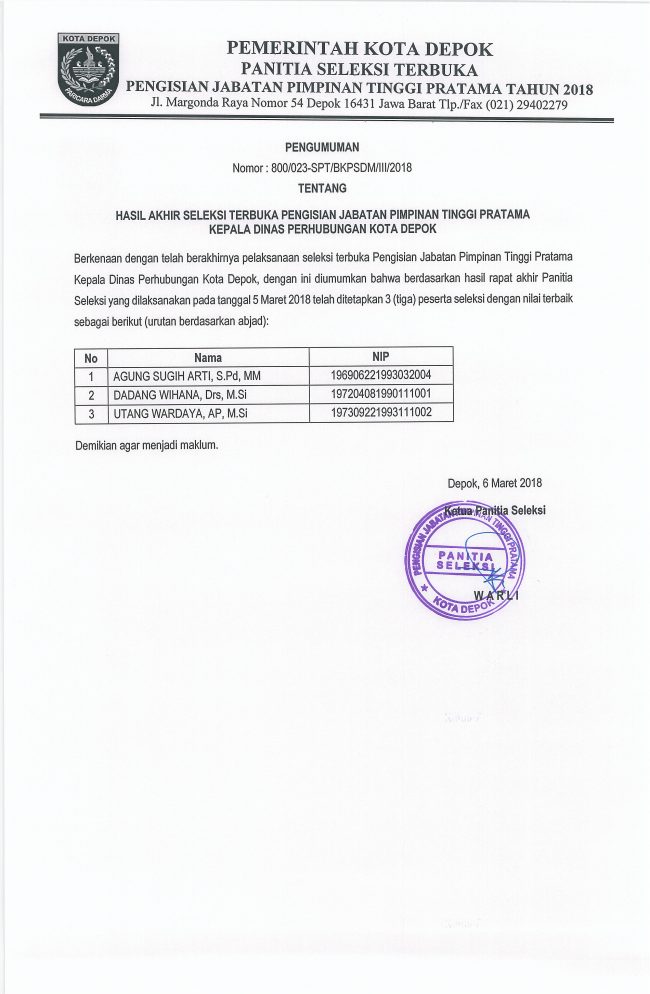 Pengumuman Hasil Akhir Seleksi Terbuka Pengisian JPT Pratama Kadishub Kota Depok