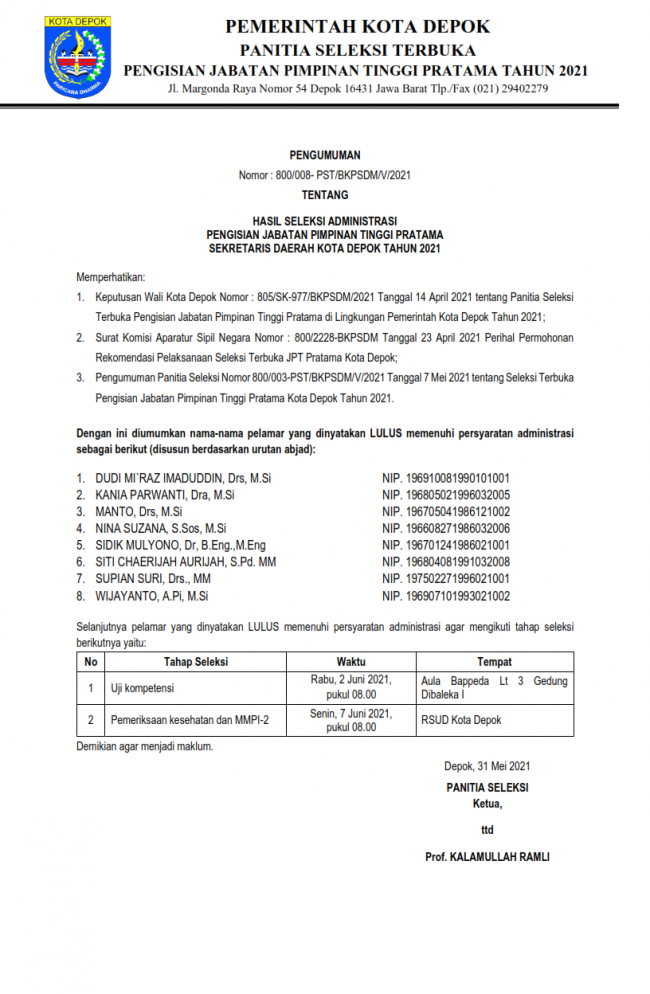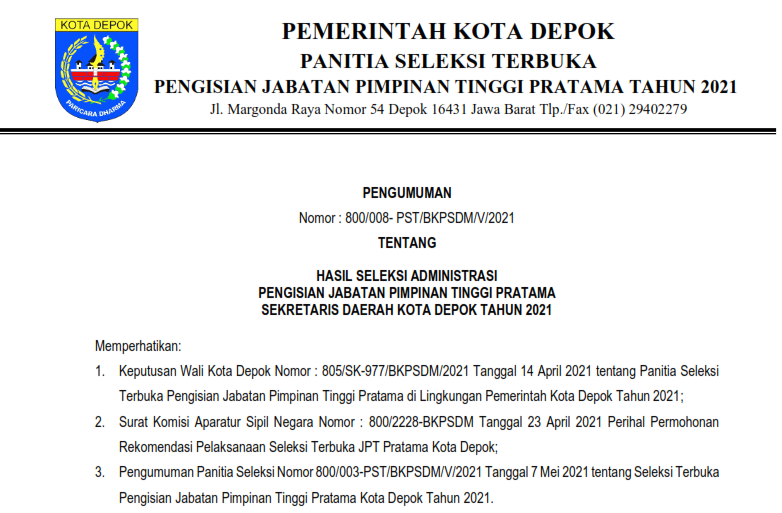 Pengumuman Hasil Seleksi Administrasi Pengisian Jabatan Pimpinan Tinggi Pratama Sekretaris Daerah Kota Depok Tahun 2021