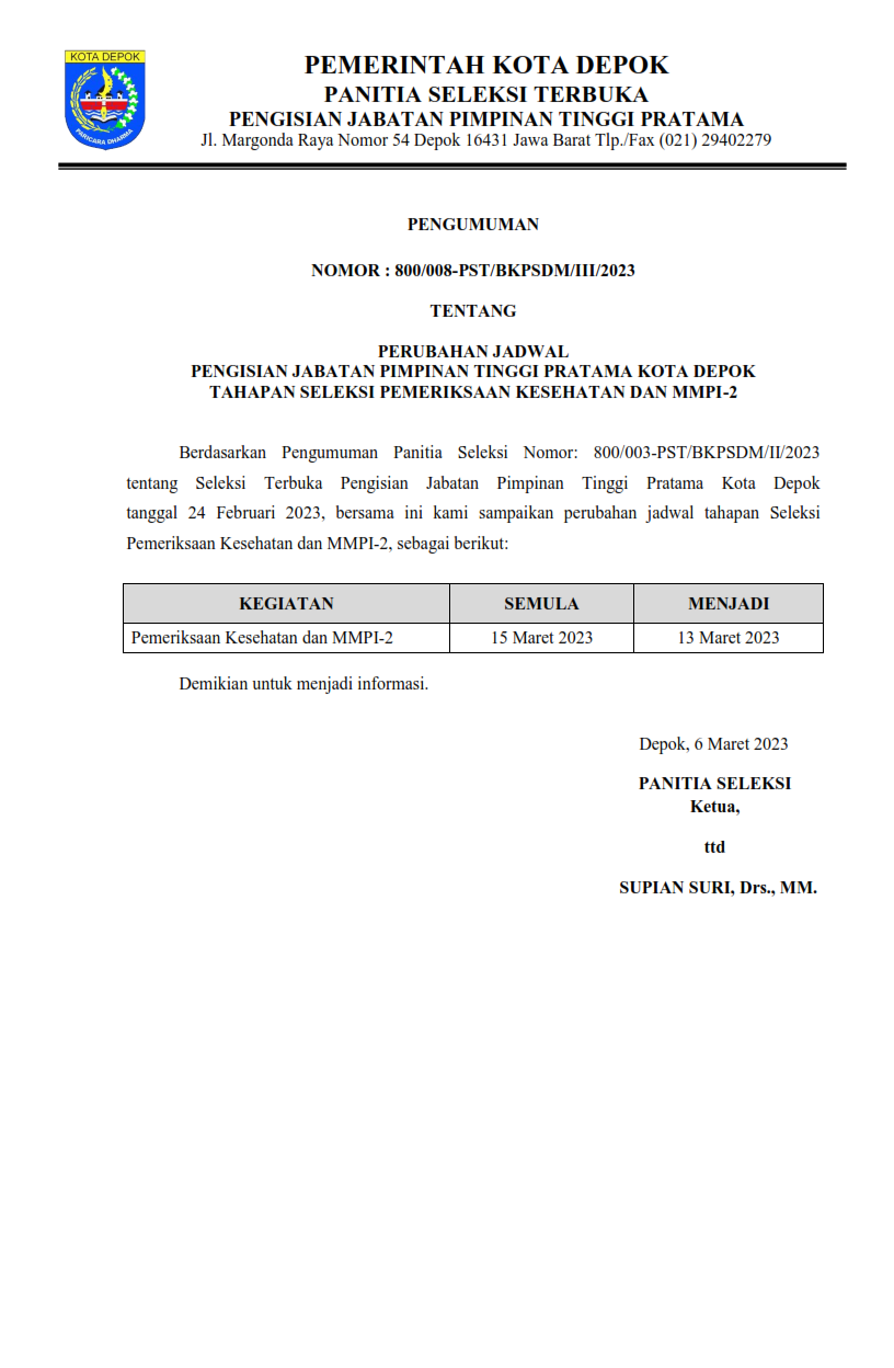 PENGUMUMAN PERUBAHAN JADWAL PENGISIAN JABATAN PIMPINAN TINGGI PRATAMA KOTA DEPOK