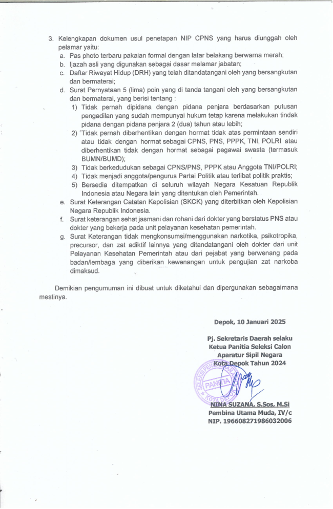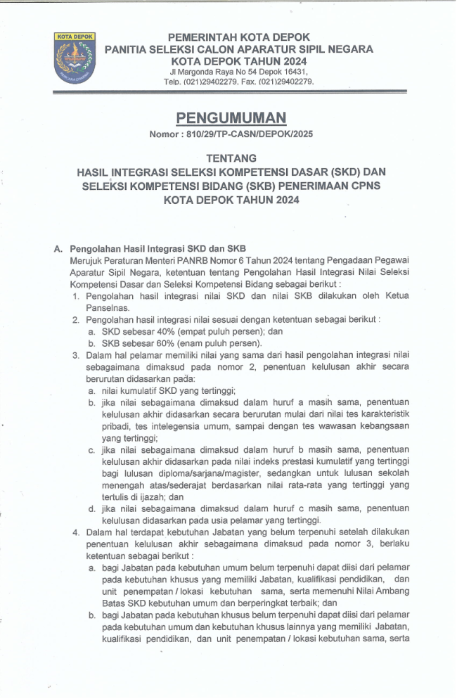 Pengumuman Hasil Integrasi SKD dan SKB Penerimaan CPNS Kota Depok Tahun 2024