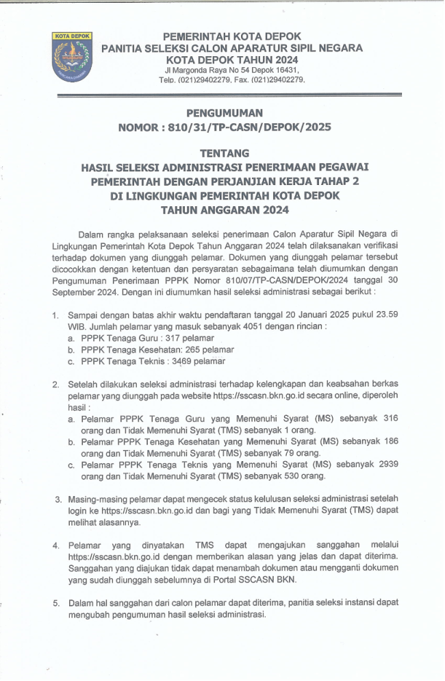 Pengumuman Hasil Seleksi Administrasi Penerimaan PPPK Tahap 2 di Lingkungan Pemerintah Kota Depok Tahun Anggaran 2024