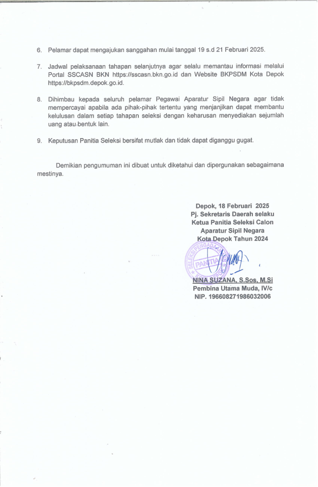 Lampiran I – Pengumuman Hasil Seleksi Administrasi PPPK Tahap 2 Kota Depok Tahun 2024
