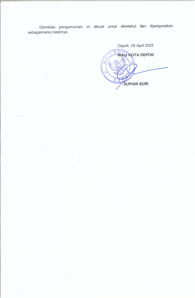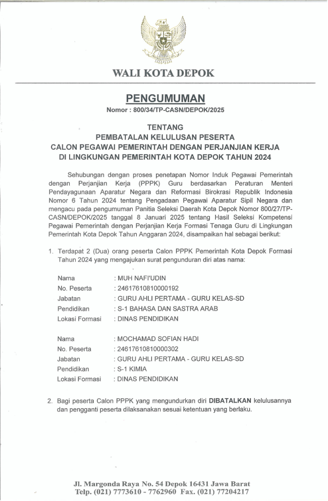 Pengumuman Pembatalan Kelulusan Peserta Calon Pegawai Pemerintah dengan Perjanjian Kerja di Lingkungan Pemerintah Kota Depok Tahun 2024