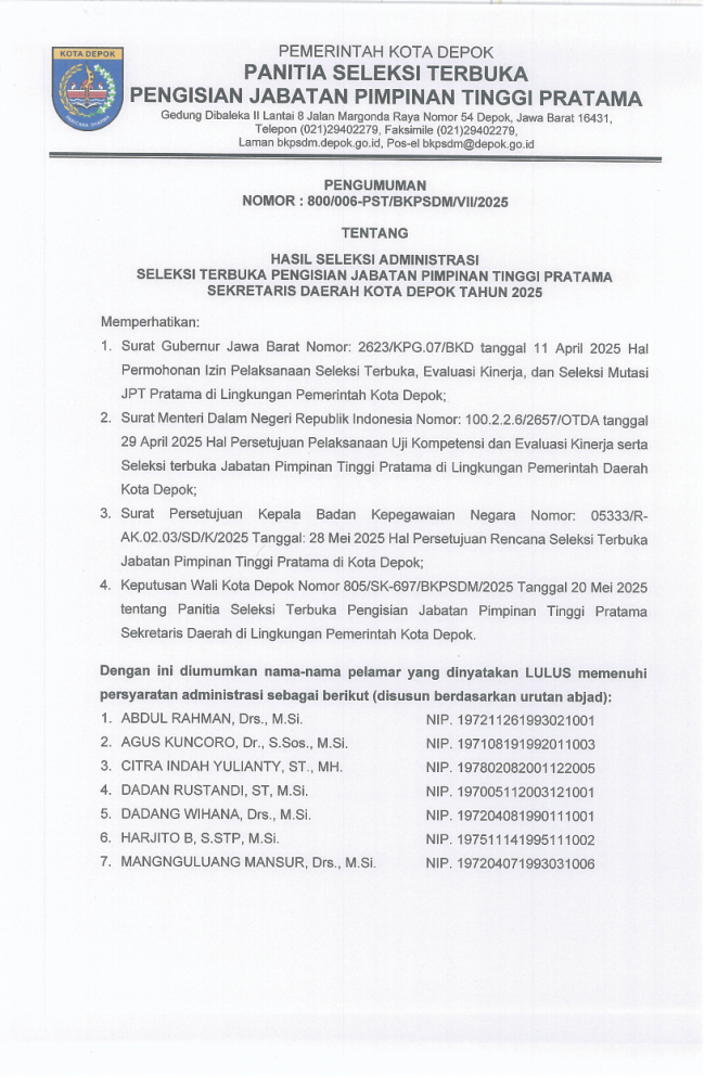 Beranda / Berita BKPSDM / Pengumuman Hasil Seleksi Administrasi Seleksi Terbuka Pengisian JPT Pratama Sekretaris Daerah Kota Depok Tahun 2025